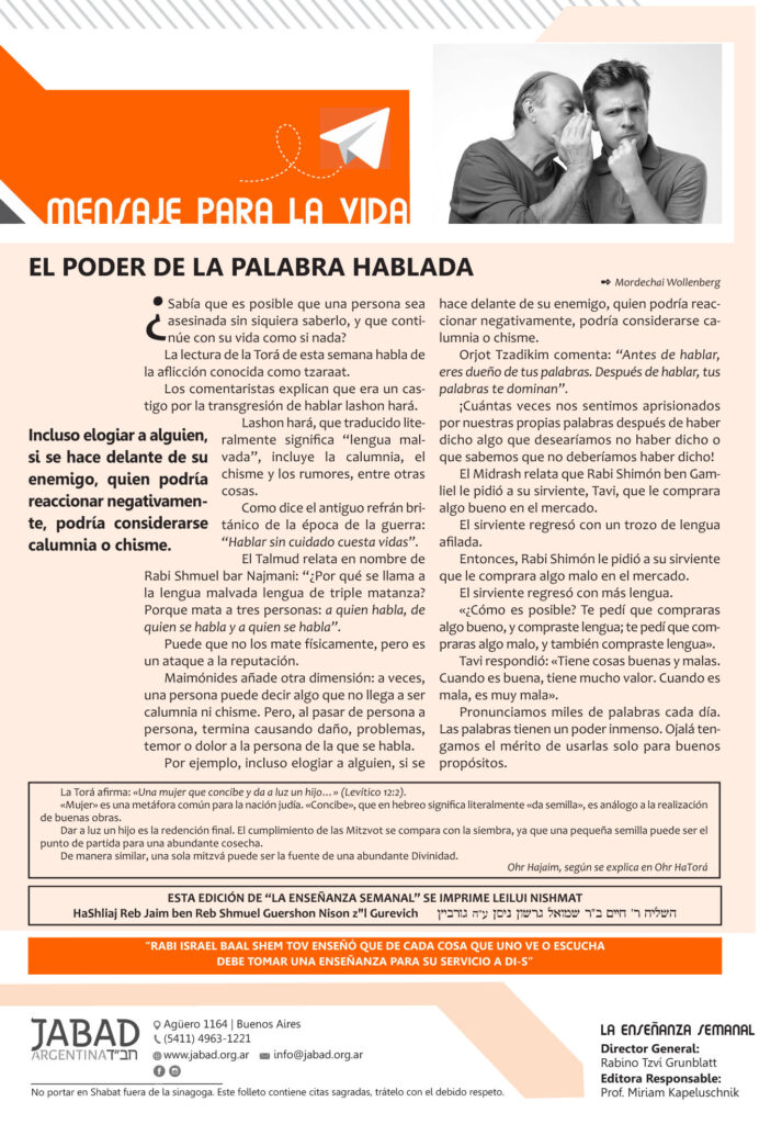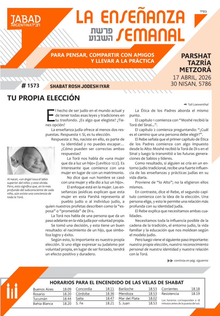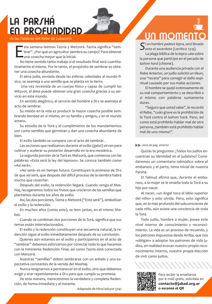 Enseñanza semanal, parashá Tazría Metzorá DESCARGÁ EN PDF Director General:Rabino Tzví GrunblattEditora Responsable:Prof. Miriam Kapeluschnik